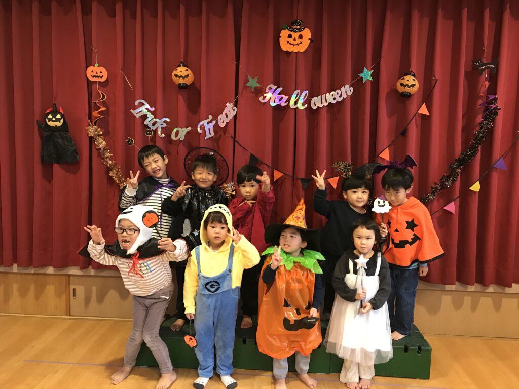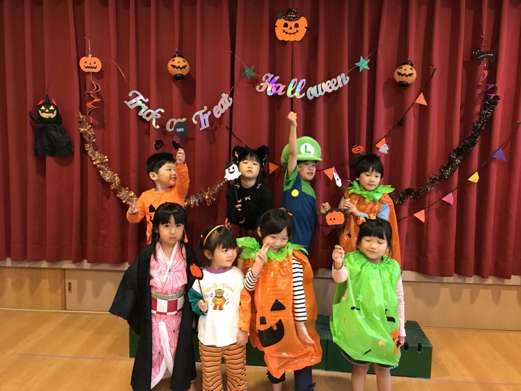 先月の31日にハロウィンパーティーをしました。家から仮装を持ってきてもらってもらい、それぞれ好きな格好をしての参加でした♪