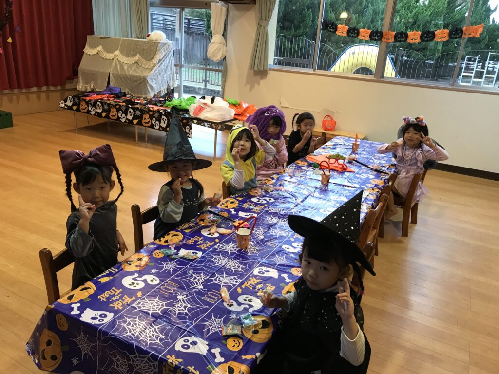 もらったお菓子をみんなで食べました。次の日も「今日もハロウィンする?」と聞いてきた子ども達です♪
