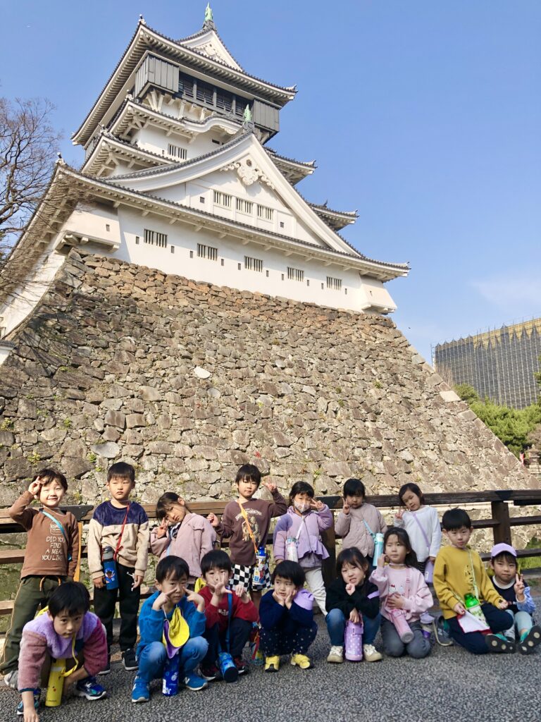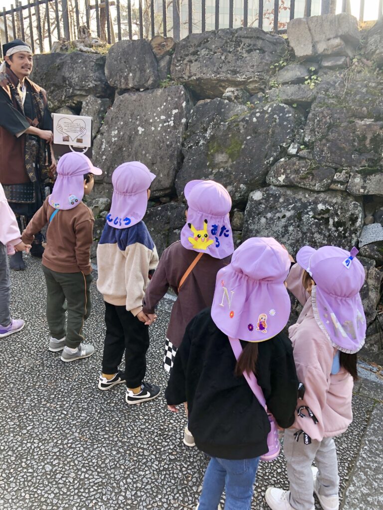 小倉城に行ってきました。バスから降りると、武将隊の方がお出迎えしてくださり、小倉城の入口まで案内してくれました。小倉城の石垣は海の石と山の石が使われていること、ハートの石や大きな鏡石があることなど教えていただきましたが、みんな興味を持ってお話を聞いていました。お城の中も見どころたくさんで、楽しい時間となりました。